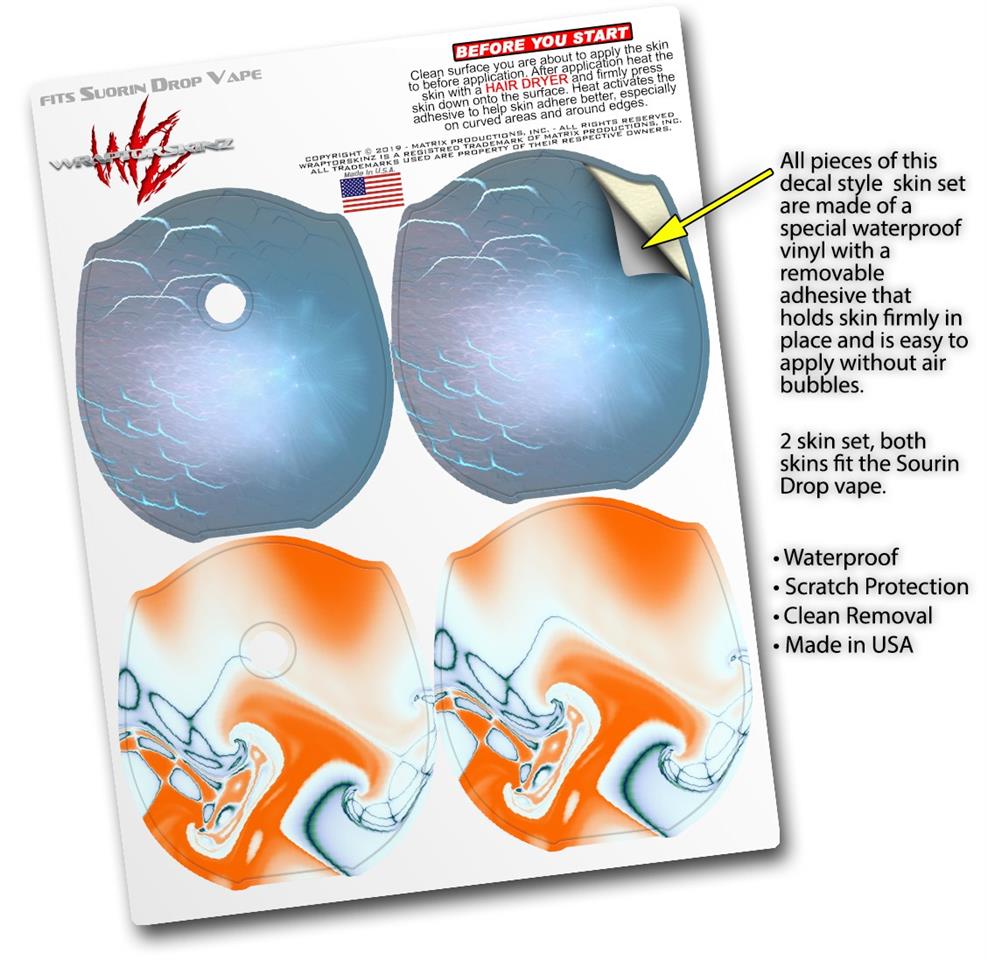 WraptorSkinz® skin wraps compatible with Suorin Drop Vape are printed using superb photo quality designs and vibrant colors printed with special fade resistant inks that last even in direct sun for years. WraptorSkinz are a composite of two layers of commercial grade materials. The bottom layer is a soft, flexible vinyl with a special removable adhesive that is easily positioned, applied without air bubbles. Next, we print the bottom layer with UV protected, fade resistant inks that deliver superb photo quality designs in vibrant colors. Finally, we bond a professional grade laminate over the entire skin adding a glossy protective finish. This product is not affiliated with or endorsed by Suorin.