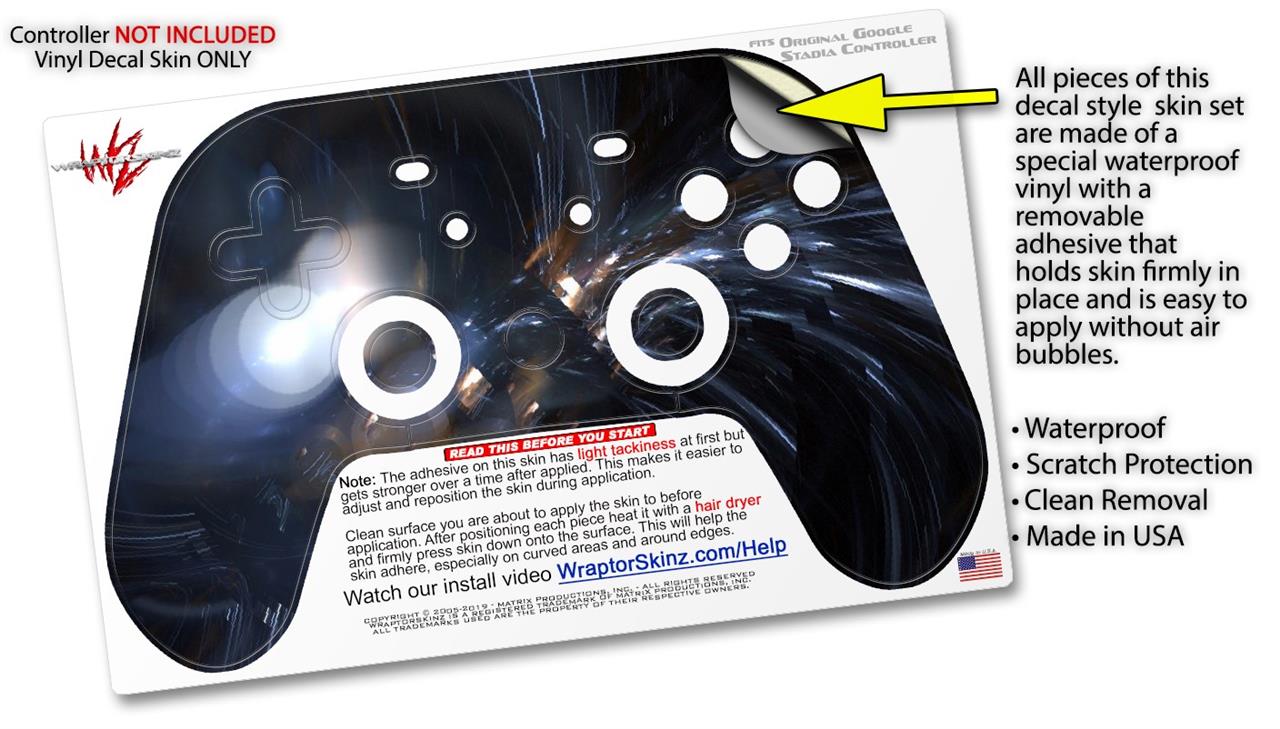 This product is in no way affiliated with or endorsed by Google. WraptorSkinz® skin wraps work with the Original Google Stadia version 1 Controller. Printed using superb photo quality designs and vibrant colors printed with special fade resistant inks that last even in direct sun for years. WraptorSkinz are a composite of two layers of commercial grade materials. The bottom layer is a soft, flexible vinyl with a special removable adhesive that is easily positioned, applied without air bubbles. Next, we print the bottom layer with UV protected, fade resistant inks that deliver superb photo quality designs in vibrant colors. Finally, we bond a professional grade laminate over the entire skin adding a glossy protective finish.