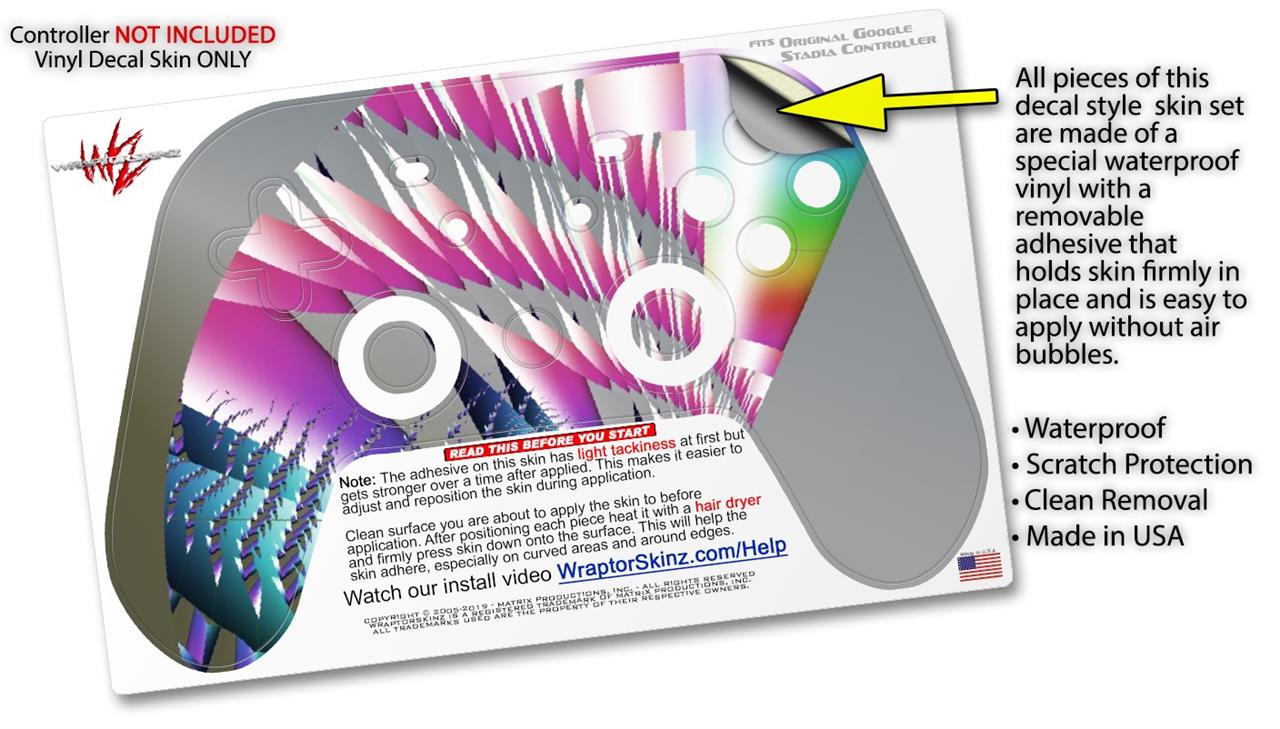 This product is in no way affiliated with or endorsed by Google. WraptorSkinz® skin wraps work with the Original Google Stadia version 1 Controller. Printed using superb photo quality designs and vibrant colors printed with special fade resistant inks that last even in direct sun for years. WraptorSkinz are a composite of two layers of commercial grade materials. The bottom layer is a soft, flexible vinyl with a special removable adhesive that is easily positioned, applied without air bubbles. Next, we print the bottom layer with UV protected, fade resistant inks that deliver superb photo quality designs in vibrant colors. Finally, we bond a professional grade laminate over the entire skin adding a glossy protective finish.