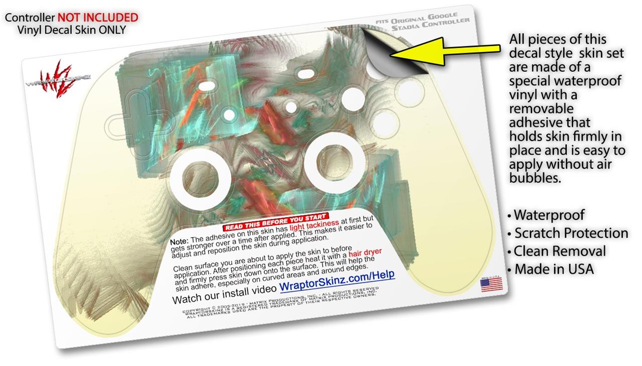 This product is in no way affiliated with or endorsed by Google. WraptorSkinz® skin wraps work with the Original Google Stadia version 1 Controller. Printed using superb photo quality designs and vibrant colors printed with special fade resistant inks that last even in direct sun for years. WraptorSkinz are a composite of two layers of commercial grade materials. The bottom layer is a soft, flexible vinyl with a special removable adhesive that is easily positioned, applied without air bubbles. Next, we print the bottom layer with UV protected, fade resistant inks that deliver superb photo quality designs in vibrant colors. Finally, we bond a professional grade laminate over the entire skin adding a glossy protective finish.