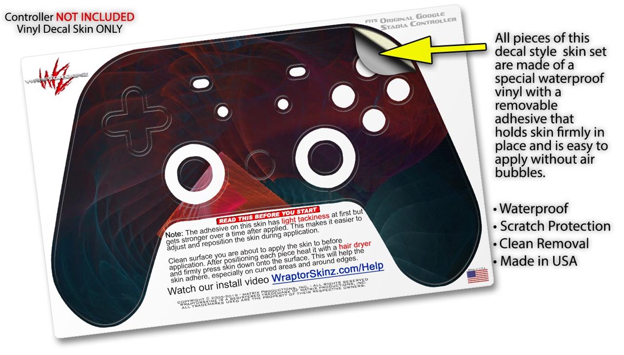This product is in no way affiliated with or endorsed by Google. WraptorSkinz® skin wraps work with the Original Google Stadia version 1 Controller. Printed using superb photo quality designs and vibrant colors printed with special fade resistant inks that last even in direct sun for years. WraptorSkinz are a composite of two layers of commercial grade materials. The bottom layer is a soft, flexible vinyl with a special removable adhesive that is easily positioned, applied without air bubbles. Next, we print the bottom layer with UV protected, fade resistant inks that deliver superb photo quality designs in vibrant colors. Finally, we bond a professional grade laminate over the entire skin adding a glossy protective finish.