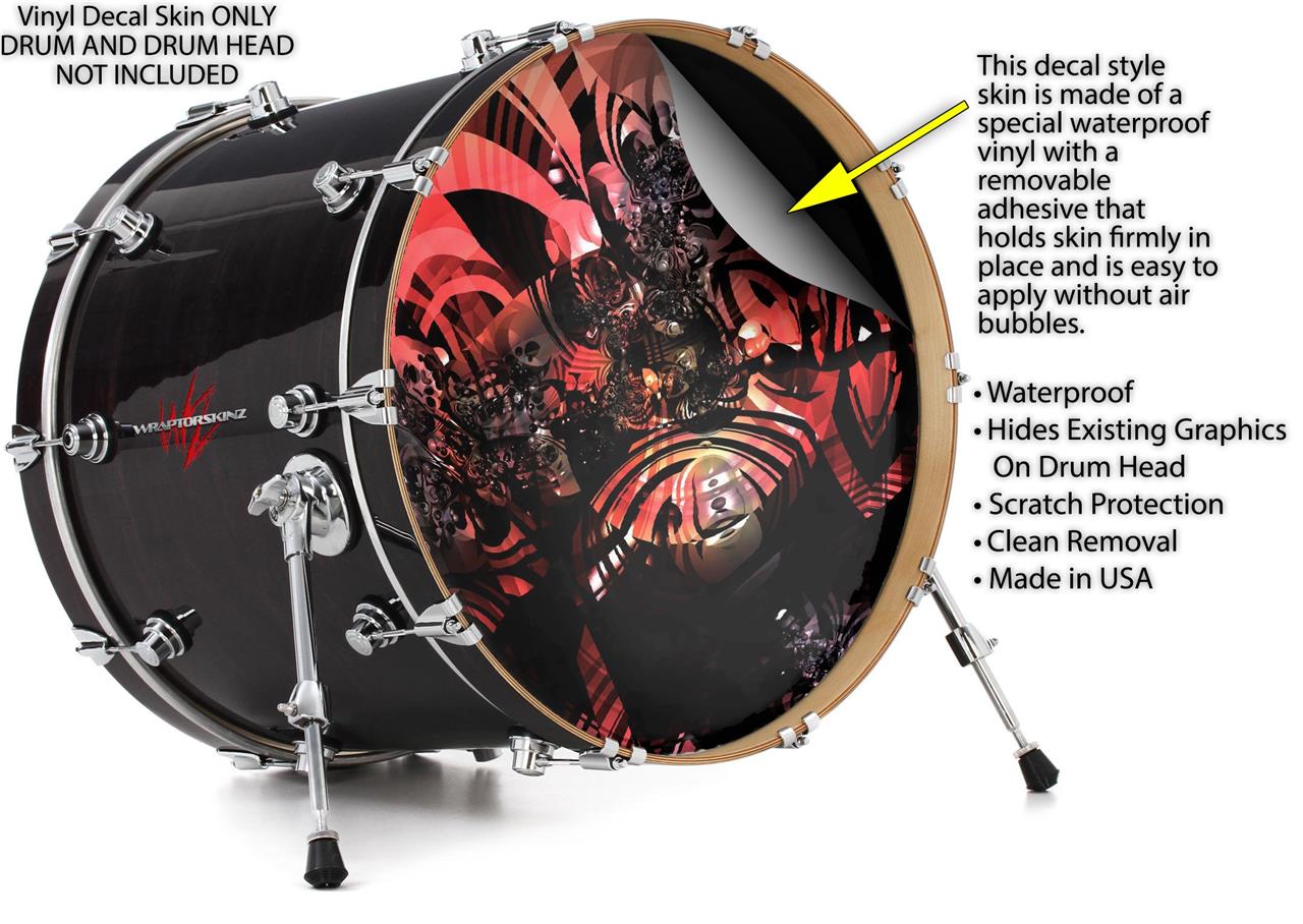 This design also available in other sizes. WraptorSkinz® skin wraps compatible with most kick drum heads. Printed using superb photo quality designs and vibrant colors printed with special fade resistant inks that last even in direct sun for years. WraptorSkinz are a composite three layer commercial grade materials vinyl. The bottom layer is a air release, grey block out removable adhesive that hides existing graphics on the drum head and is easily applied without air bubbles. The middle layer is a flexible vinyl printed with UV protected, fade resistant inks that deliver superb photo quality designs in vibrant colors. Finally, we bond a professional grade laminate over the entire skin adding a glossy protective finish.
