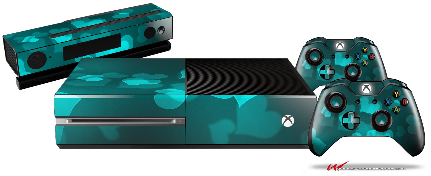 Bokeh Hearts Neon Teal - Holiday Bundle Decal Style Skin fits XBOX One Console Original, Kinect and 2 Controllers (XBOX SYSTEM NOT INCLUDED)